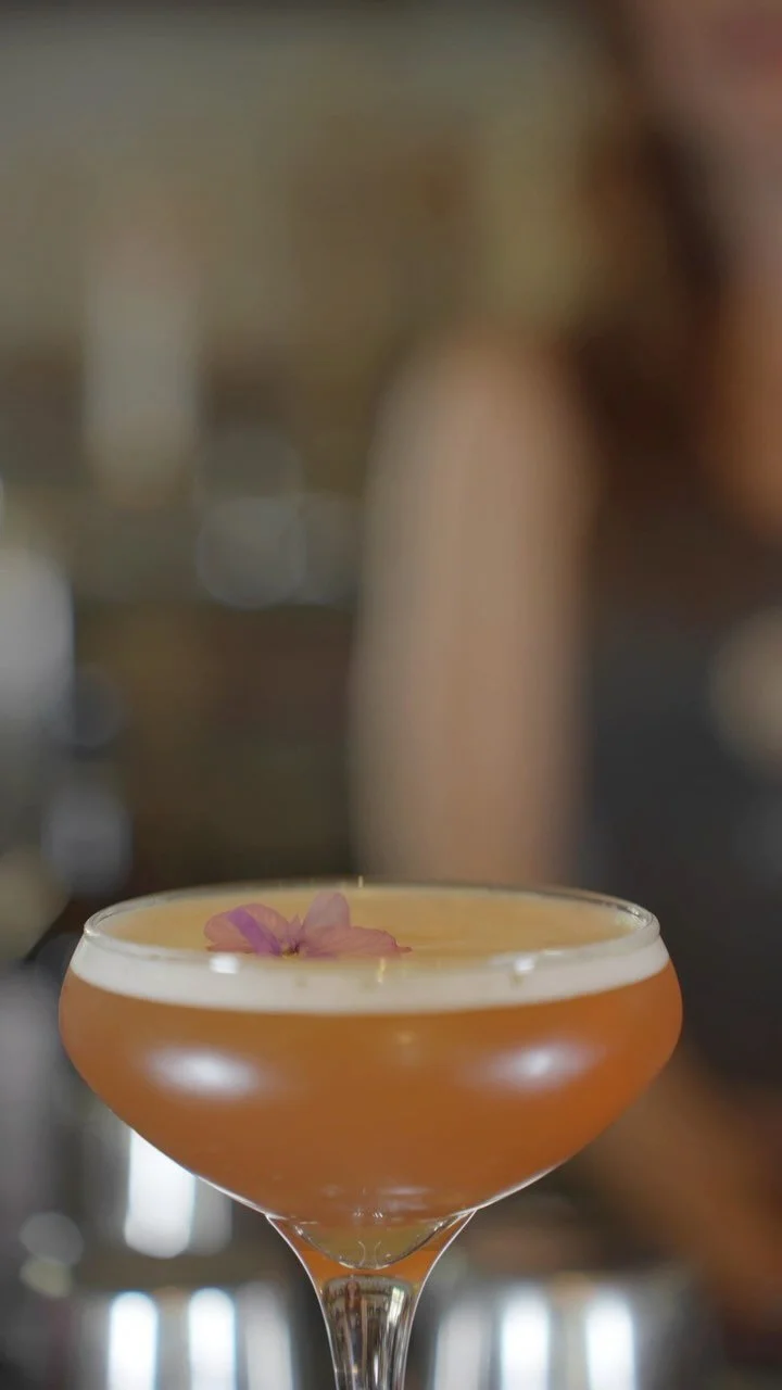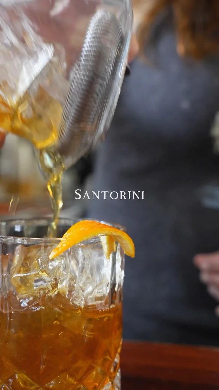 Two signature cocktails at Opa Greek Cafe: 'The Cure for Pain' made with whiskey and 'The Aphrodite' made with vodka, beautifully presented on our outdoor patio
